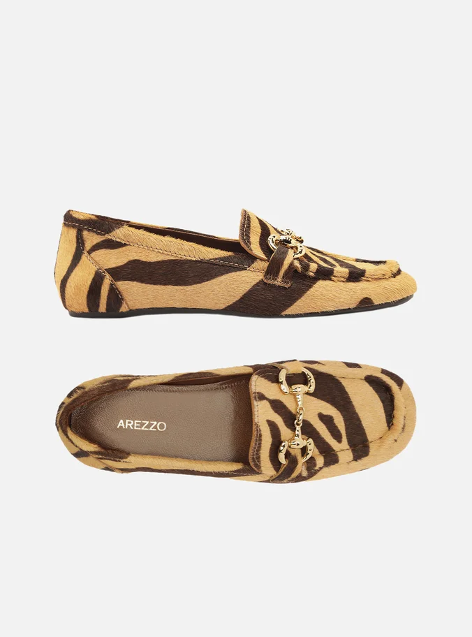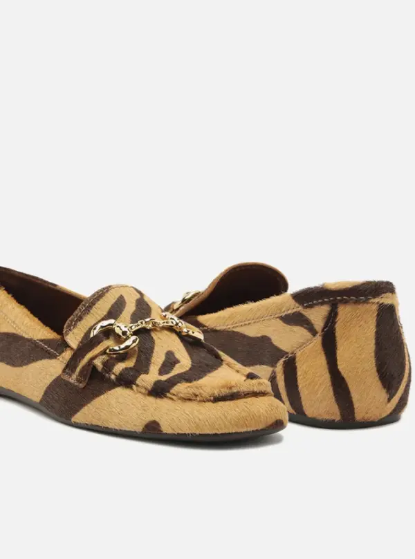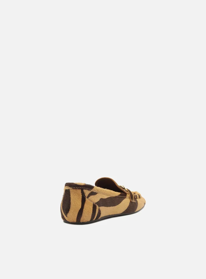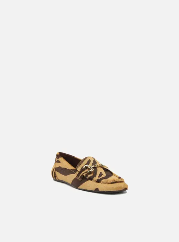 Women’s brown and beige loafer in animal-print fur. The shoe has a flat heel and a square toe. Closed design, featuring a side cut on the vamp and a hammered metal bit detail on the upper. It has visible stitching on the front and exposes the entire upper part of the foot.