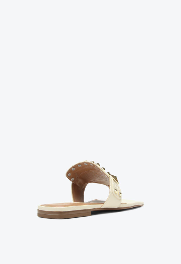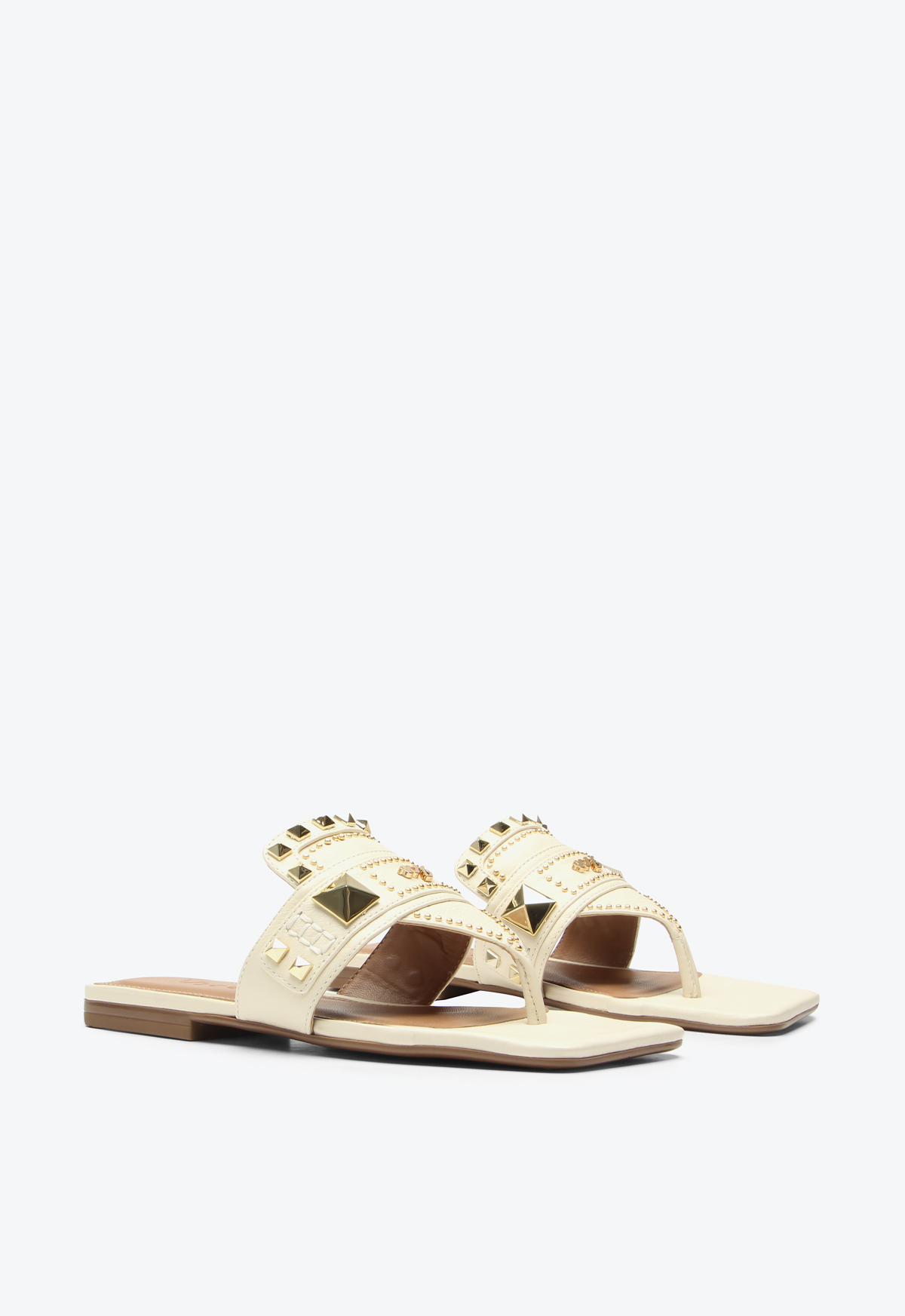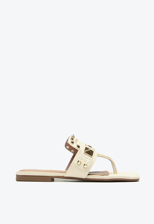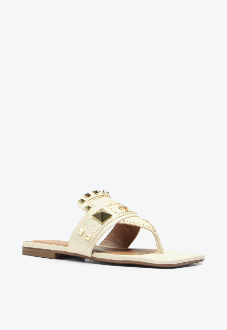 The Cascais flat in beige leather stands out for its minimalist and sophisticated design, enhanced by gold studs in various shapes that add personality to the model. It elevates both casual looks with jeans and a T-shirt and more refined outfits, reinforcing the trend of metallic details as highlights in urban ensembles.