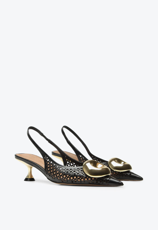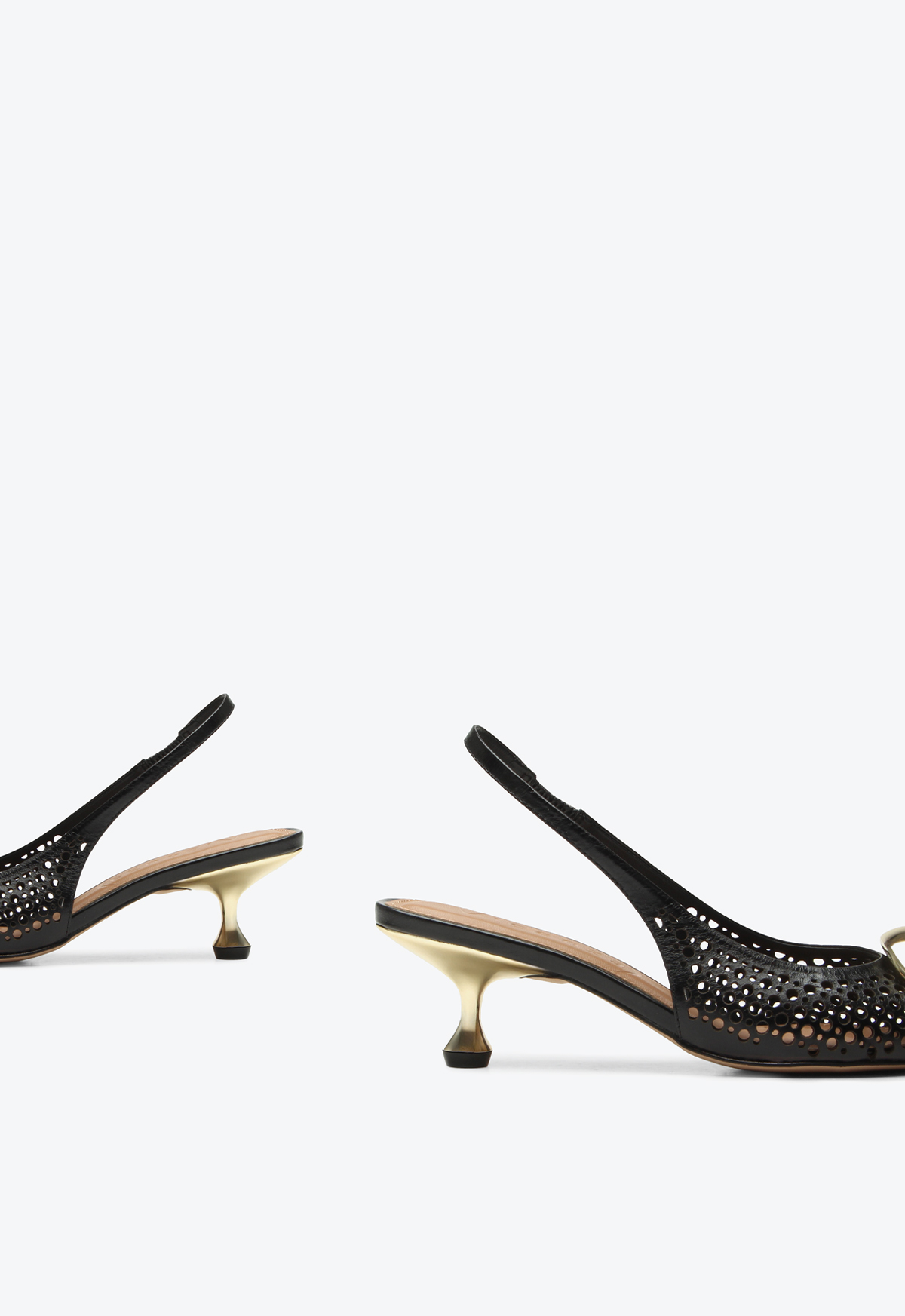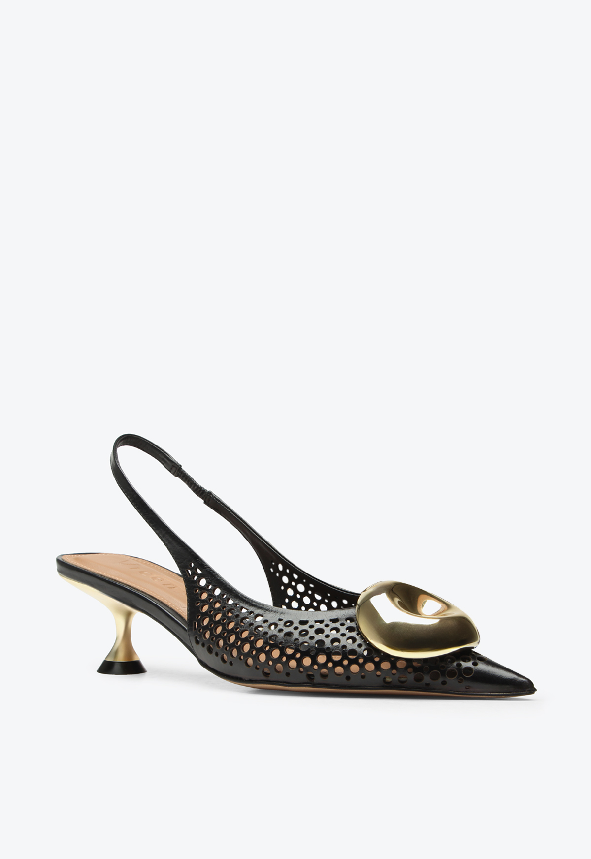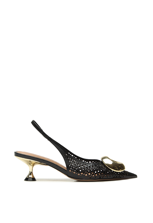 Medium-heel slingback in black leather. Featuring a pointed toe and delicate laser-cut details, this model includes a metallic front embellishment that adds a touch of sophistication to the design. With an elegant and versatile look, it’s perfect for creating classic outfits with a fashionable twist. Comfortable and stylish, it’s the ideal choice for those who seek practicality without sacrificing charm.