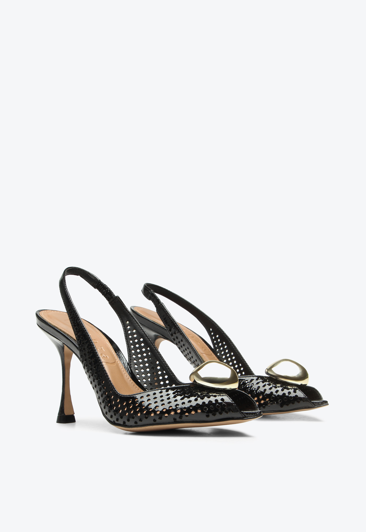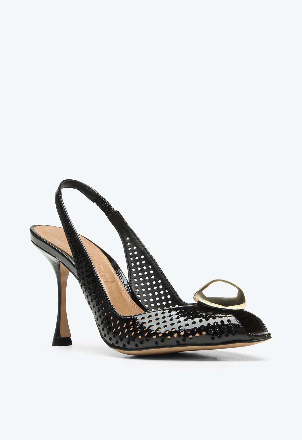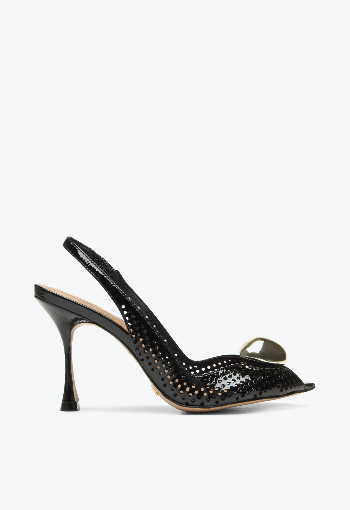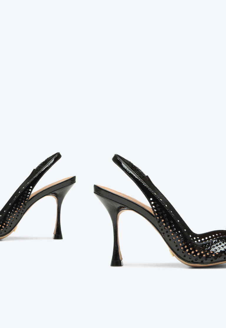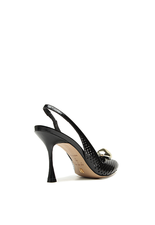 High-heel slingback in black patent leather with a metallic front detail. Featuring a pointed toe and front opening, this model combines elegance and sophistication in a classic design. The laser-cut details add delicacy and lightness to the look, while the patent finish and metallic accent provide a refined touch. Ideal for creating chic and timeless outfits, this slingback is perfect for occasions that call for a striking and elegant shoe.