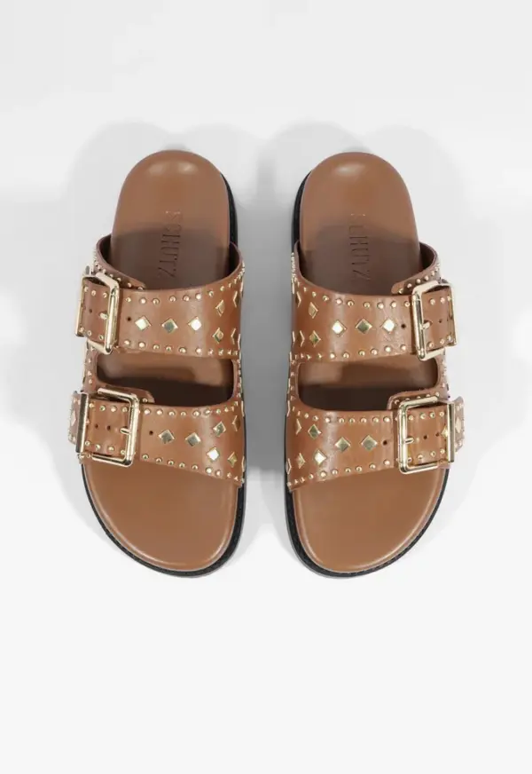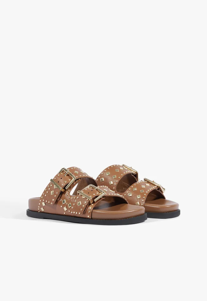 This women’s leather sandal is pure style with a modern edge you’ll want in your wardrobe. Featuring two upper straps, it comes to life with subtle rocker-style studs, while the gold buckles elevate the mood with a touch of sophisticated shine. Easy to mix and match, this slide is the perfect choice for looks that call for effortless attitude — whether paired with jeans or a trendy everyday dress.