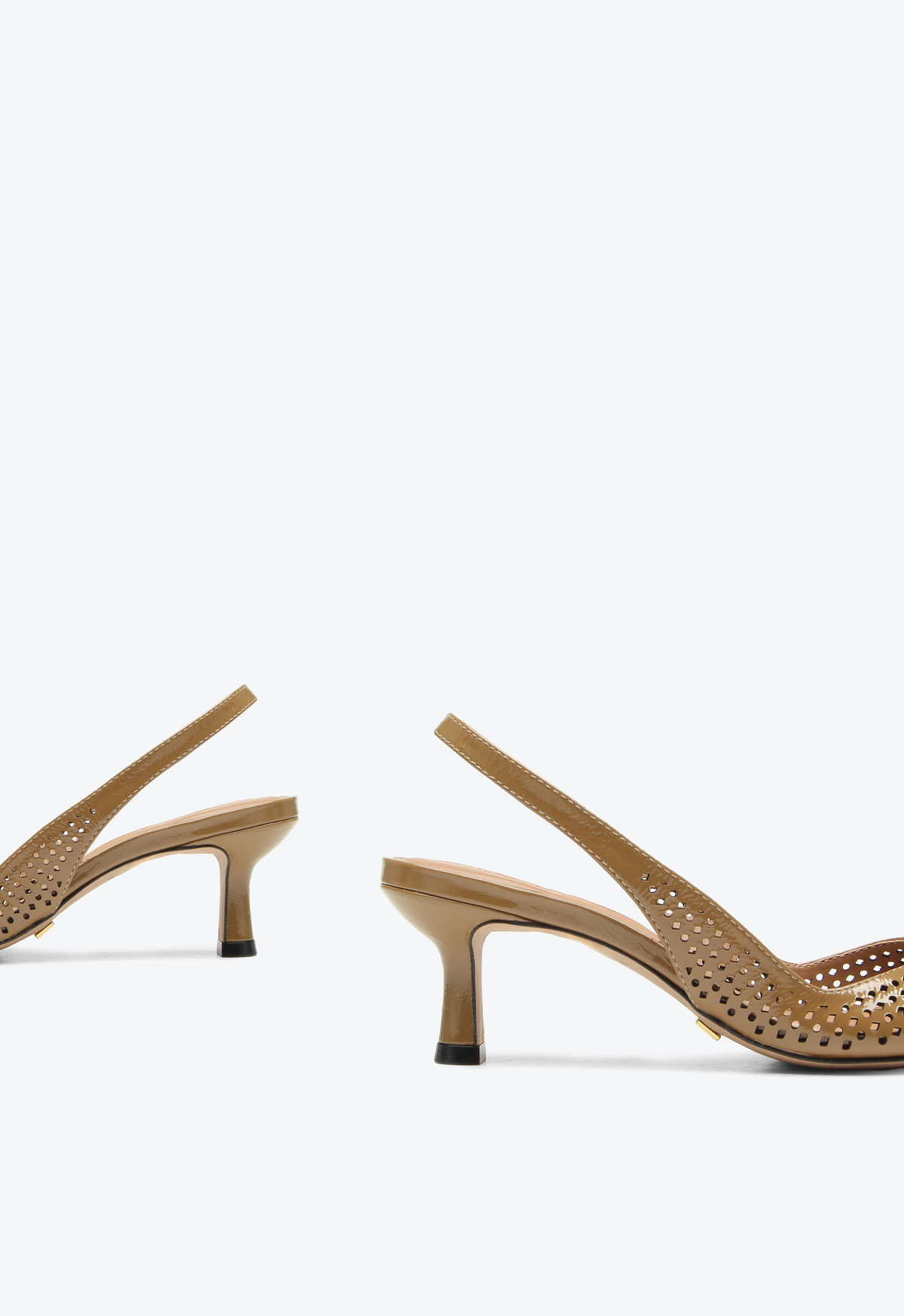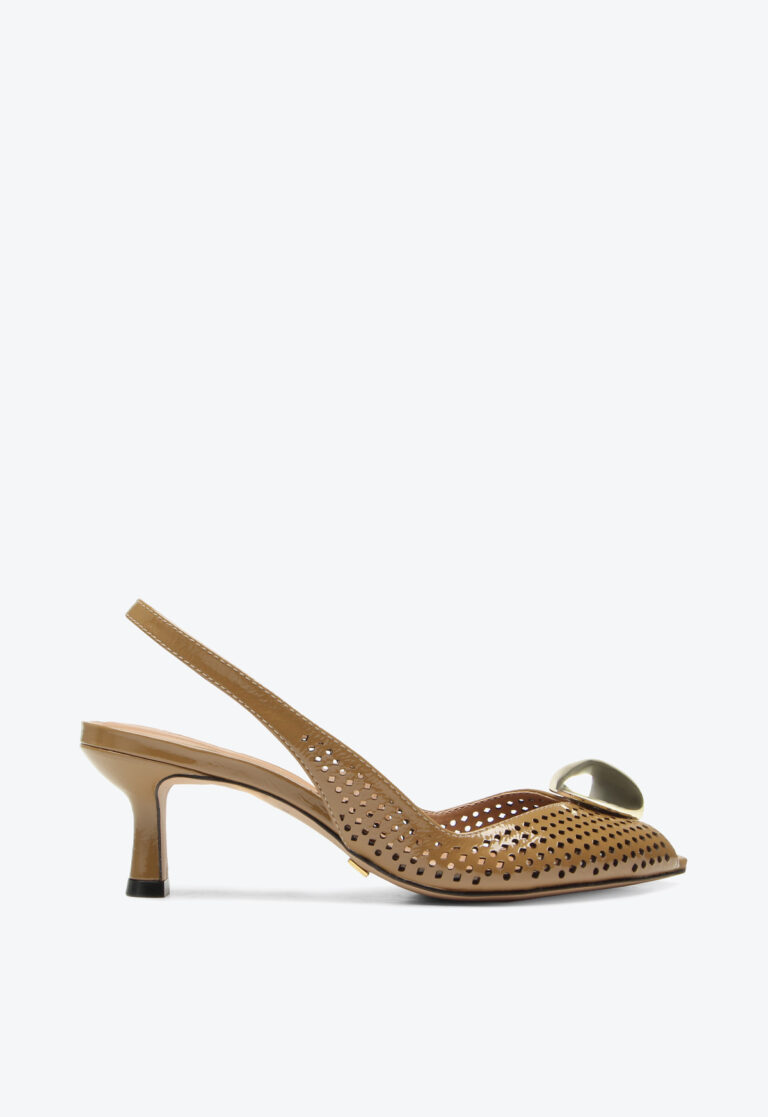 Women’s slingback with a medium caramel patent heel and metallic front detail. Featuring a classic design, this model showcases laser-cut patterns that add sophistication and delicacy to the look. The medium heel provides comfort and elegance, making it ideal for formal occasions or to elevate everyday outfits. Versatile and timeless, it’s the perfect choice for those seeking style combined with practicality.