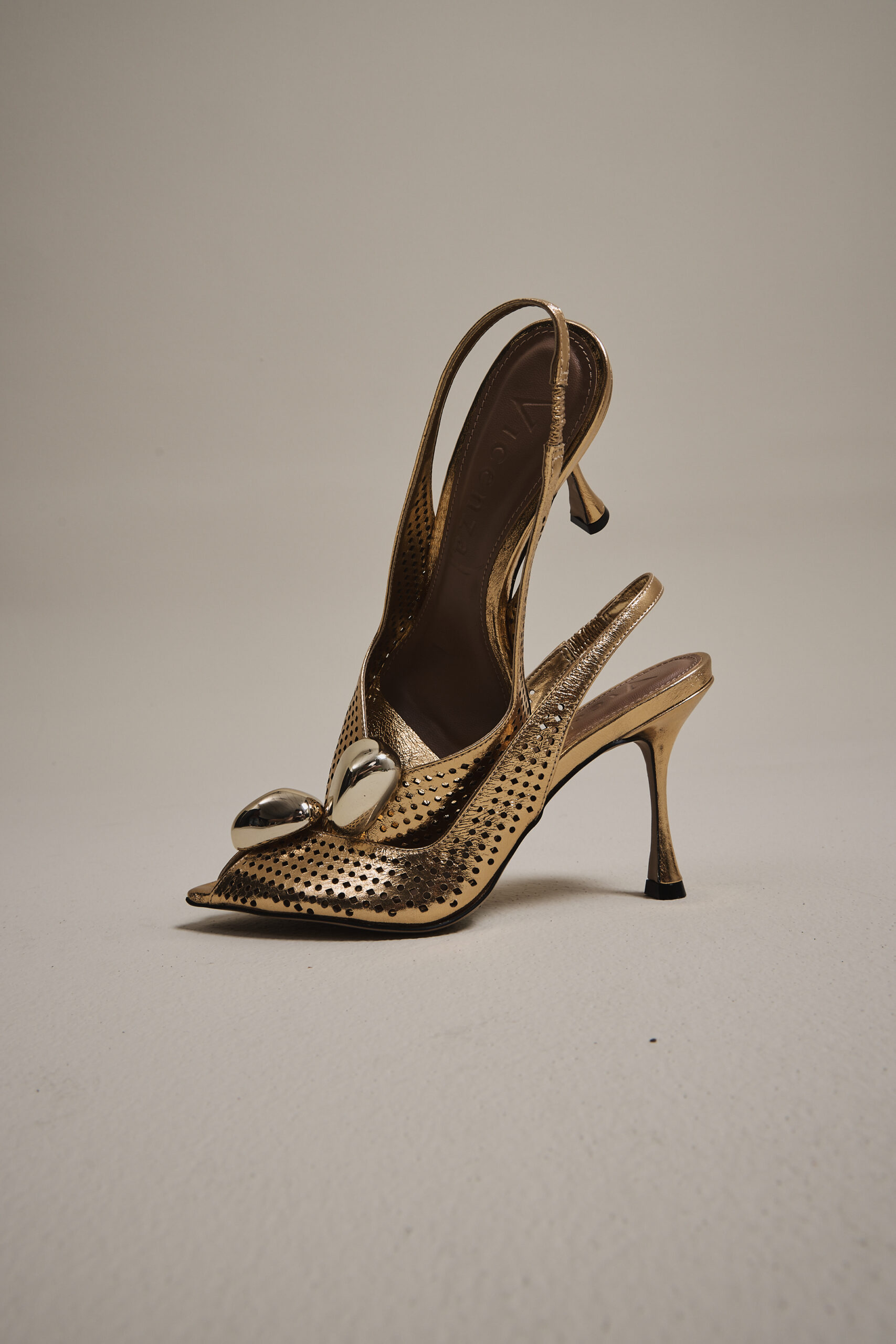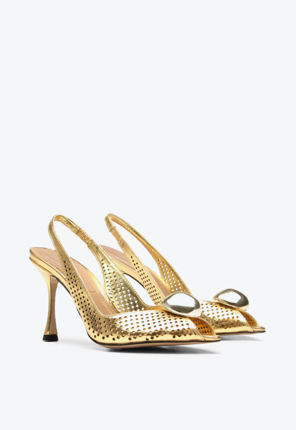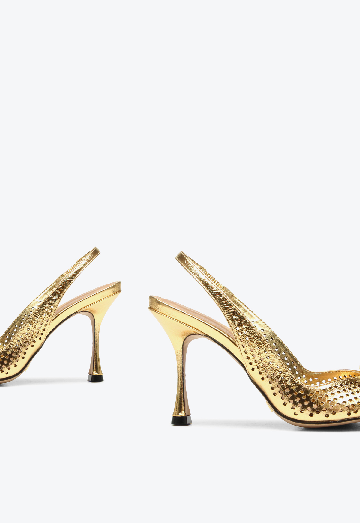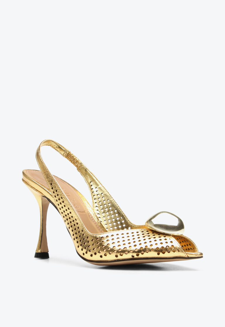 High-heel golden slingback with a metallic front detail. Featuring a pointed toe and front opening, this model combines elegance and sophistication in a classic design. The laser-cut details add delicacy and lightness to the look, while the patent finish and metallic accent provide a refined touch. Ideal for creating chic and timeless outfits, this slingback is perfect for occasions that call for a striking and elegant shoe.