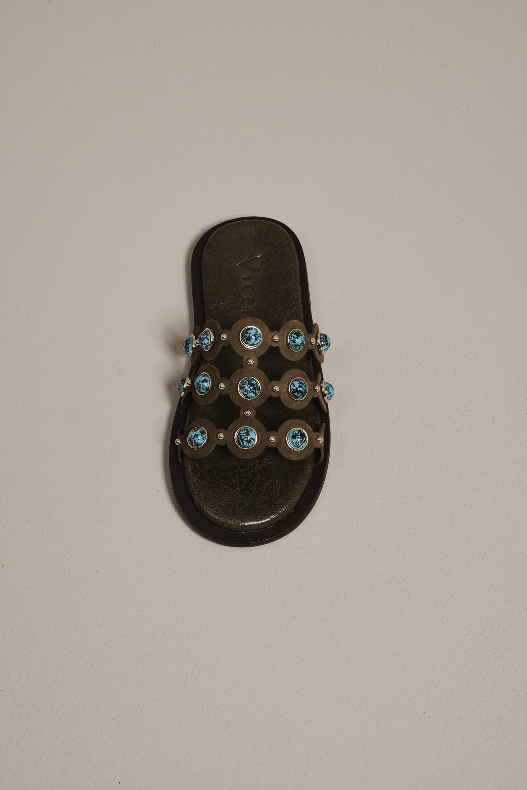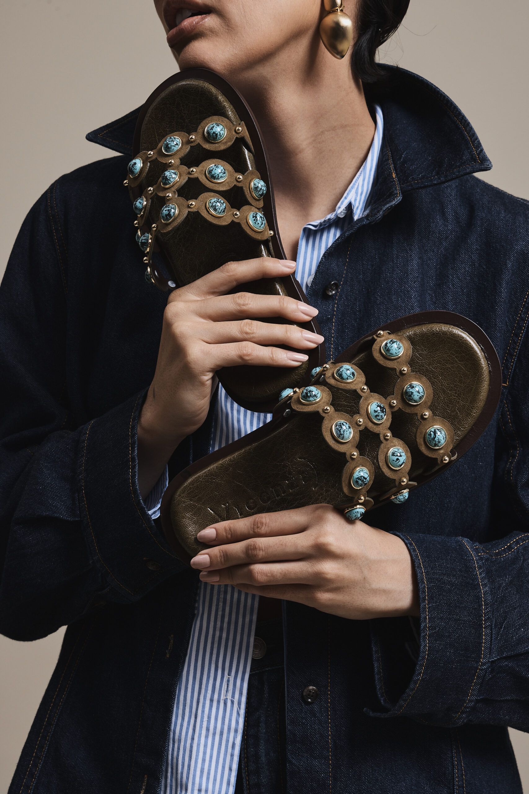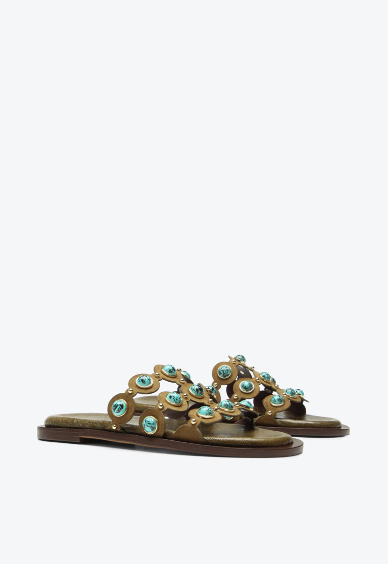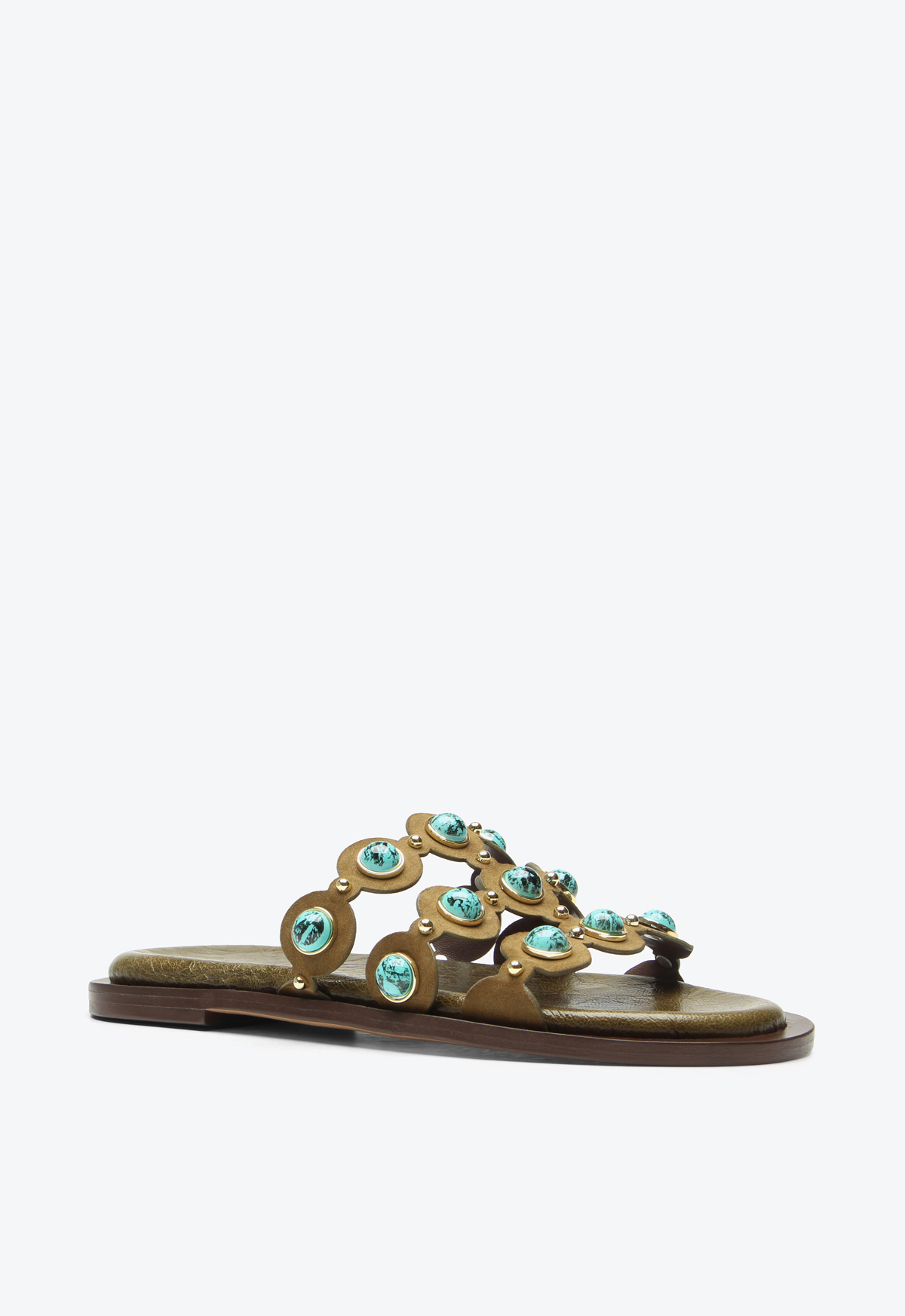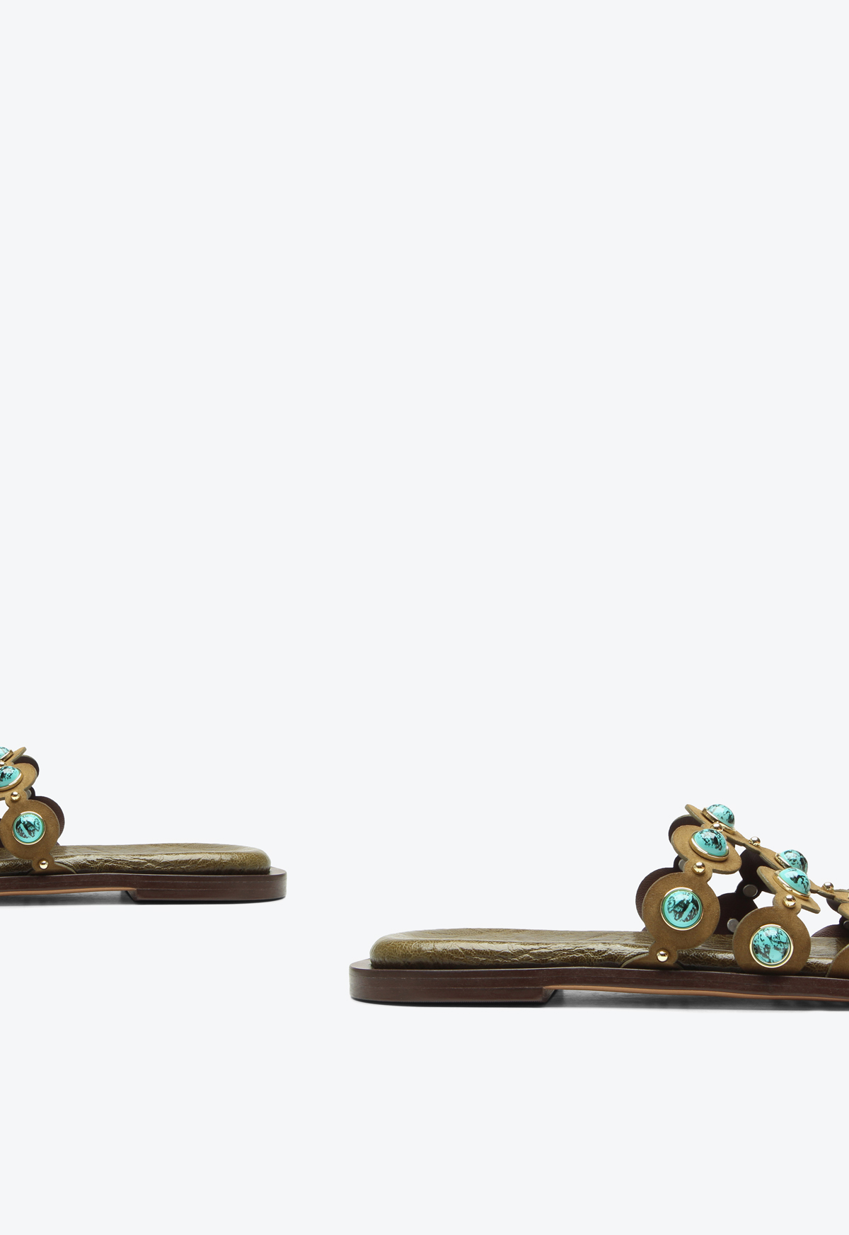 Women’s Bella flat in green leather. The Bella is a flat that combines elegance and originality in every detail. The design features laser-cut patterns and marble-effect embellishments that highlight its contemporary and sophisticated style. The textured leather insole ensures comfort and charm, while the visible leather welt reinforces its handcrafted finish. Perfect for those seeking a versatile flat full of style and personality for everyday wear.