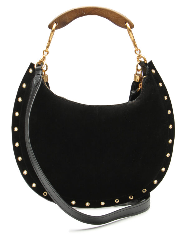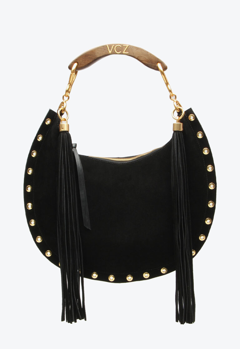Large black suede Marinah bag with a top handle. Full of personality, this bag features a half-moon design with fringes that highlight its boho and rustic style. The handle includes a gold VCZ logo that adds sophistication to the model. The eyelet appliqués around the edges reinforce its handcrafted and exclusive look — perfect for anyone seeking a striking accessory full of style!