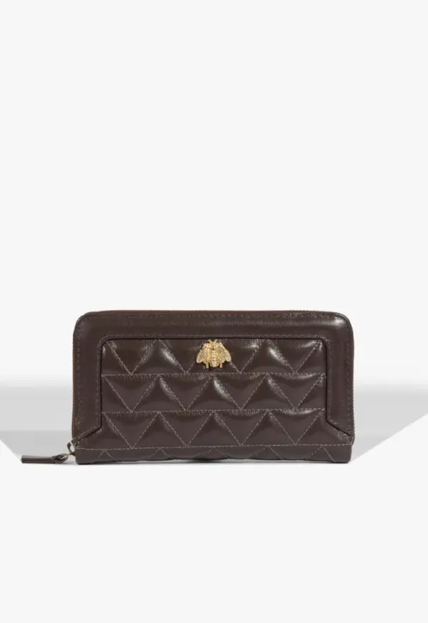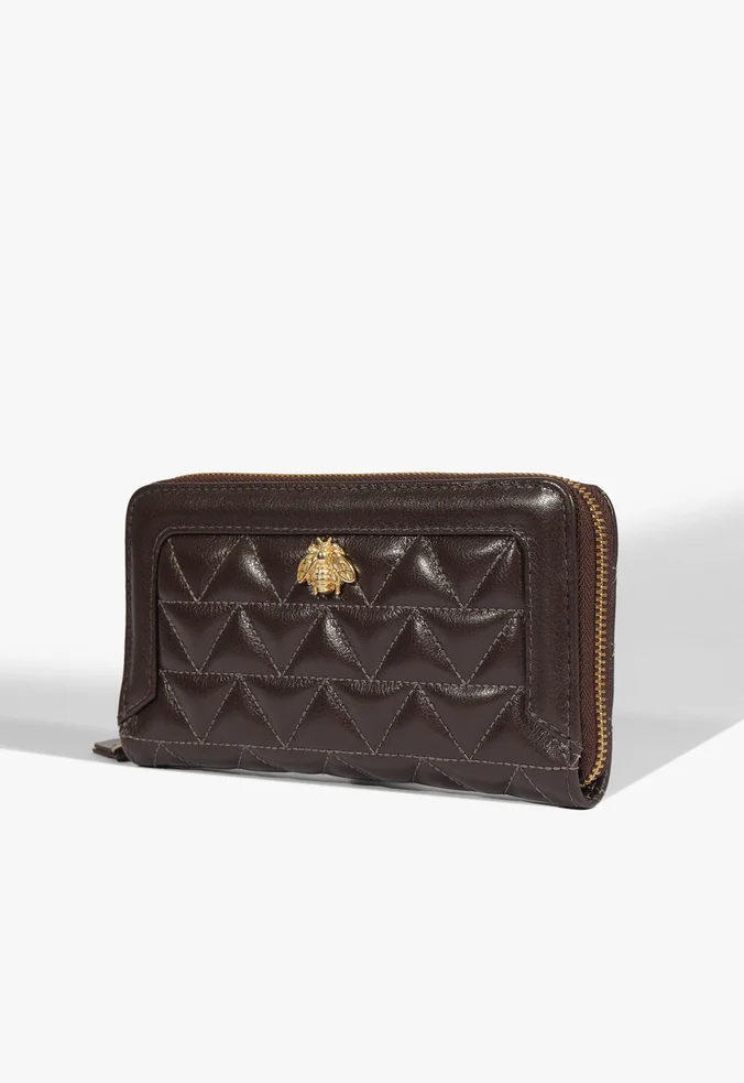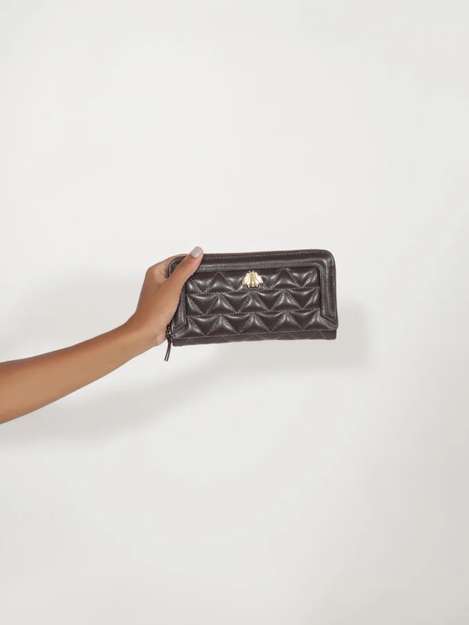 With its rectangular shape and structured construction, this Brown wallet is perfect for keeping everything you need in one place. It features multiple compartments and sections for documents, cash, and small items, along with the practicality of a zip closure. Made from quilted leather and finished with the gold Believe bee, this large women’s wallet is both sophisticated and functional — a truly refined choice!