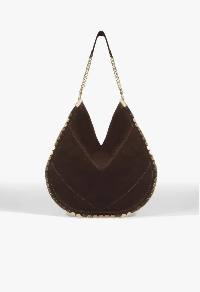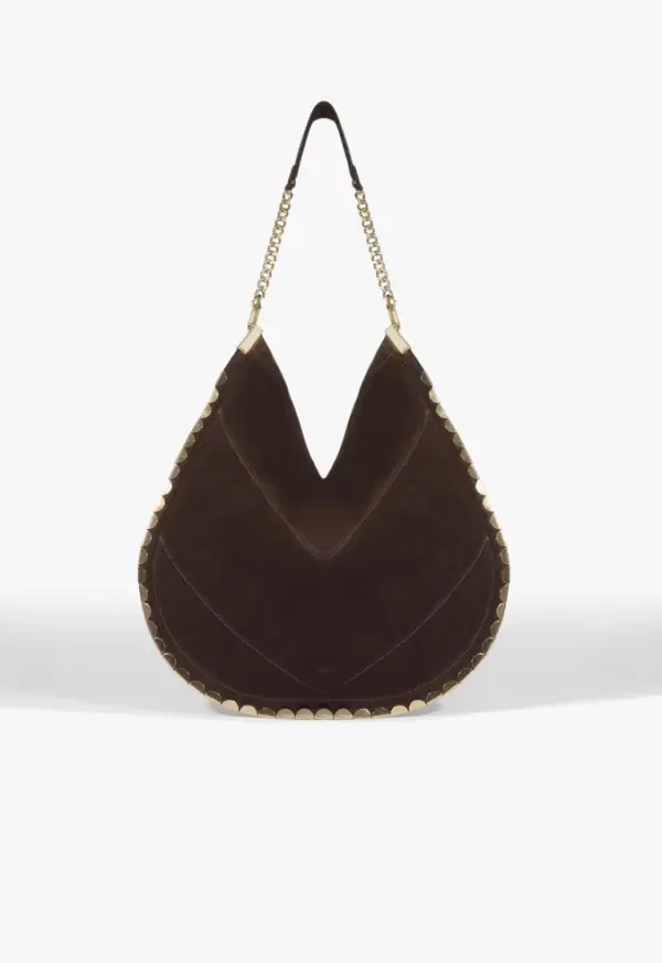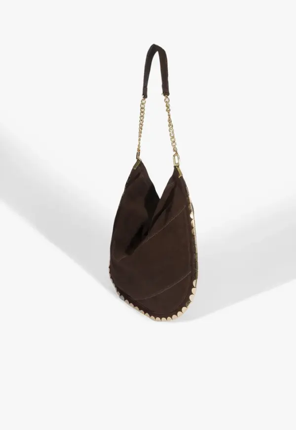 With a design that balances sophistication and attitude, this brown hobo bag is a true standout! Crafted from soft material that enhances its slouchy shape, it stands out with striking gold chevron-shaped metal appliqués on the sides. The shoulder strap, featuring an intertwined gold chain, adds a luxurious and modern touch. Perfect for elevating any look — from casual chic to evening wear — this bag offers both space and style for every occasion, ensuring you never go unnoticed.