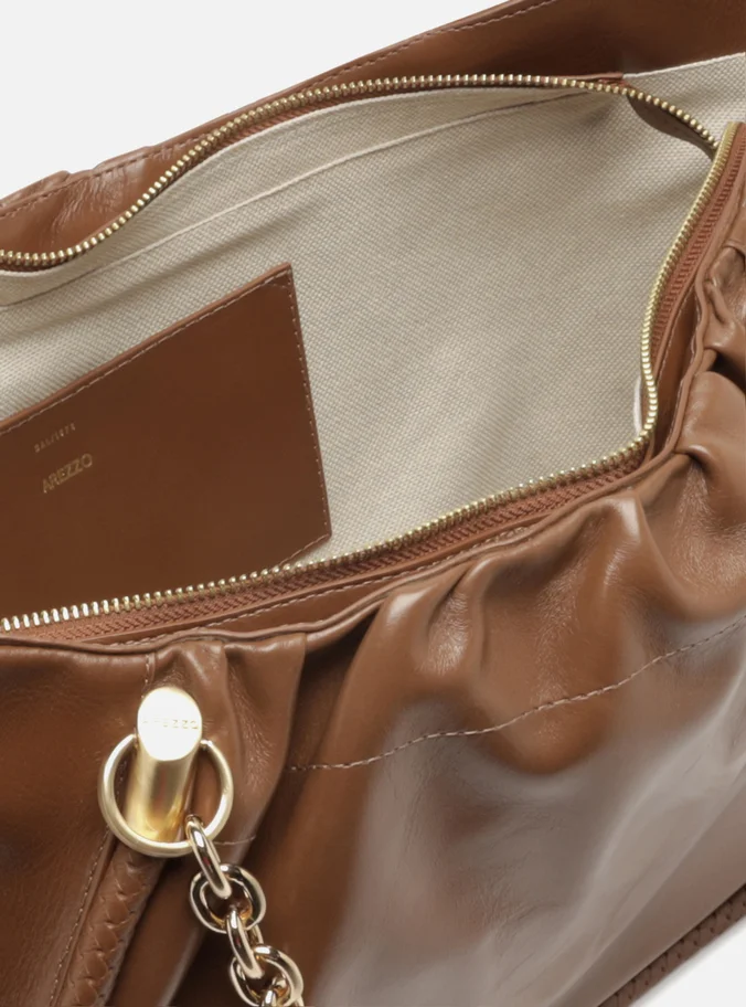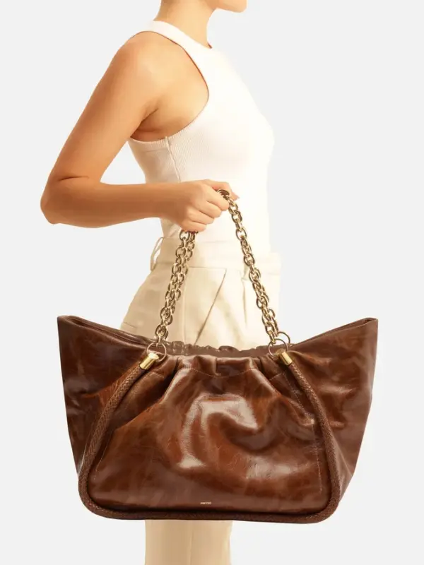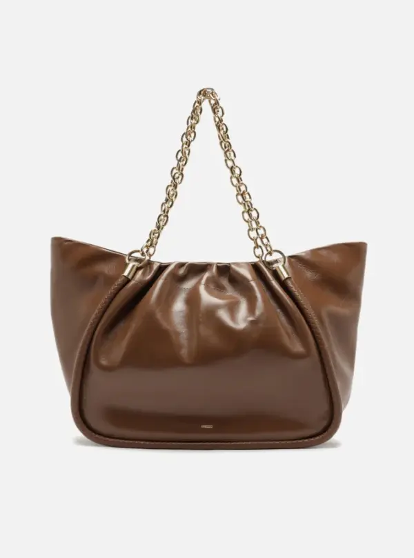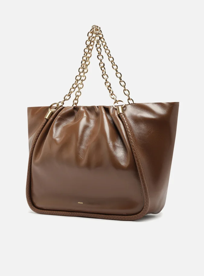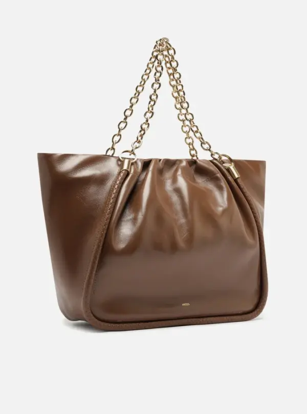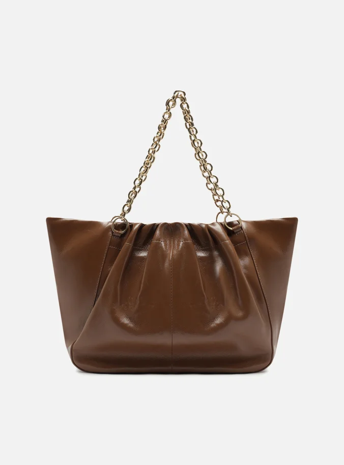 Large Caramel shopping bag in worn-effect leather. This accessory features a spacious shape, a soft, crinkled finish, and a rolled trim outlining the panels. It comes with metallic chain shoulder straps and has a top closure.