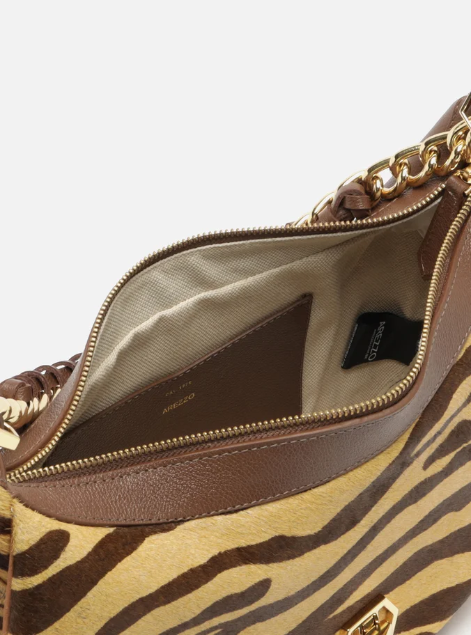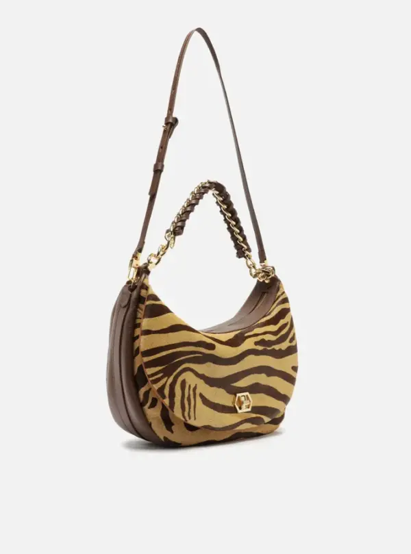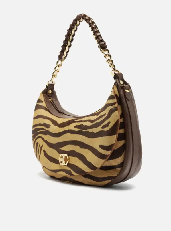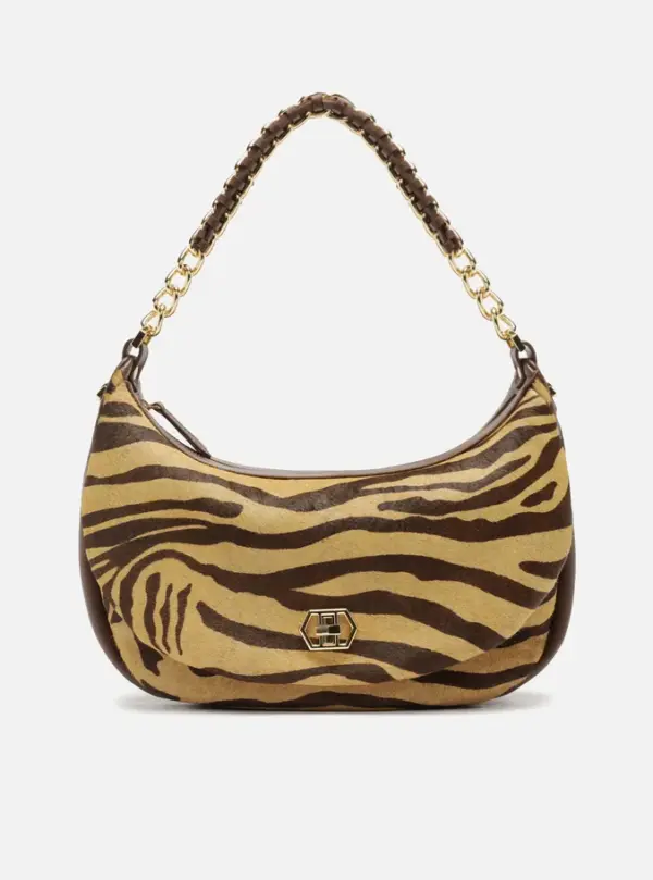 Large brown and beige animal-print hair crossbody bag. The accessory has a structured, rounded shape. It features an adjustable side strap and an extra-short metallic chain strap with interlaced leather. It has a top zipper closure with a pull tab. Includes an external front pocket with a metallic clasp detail.