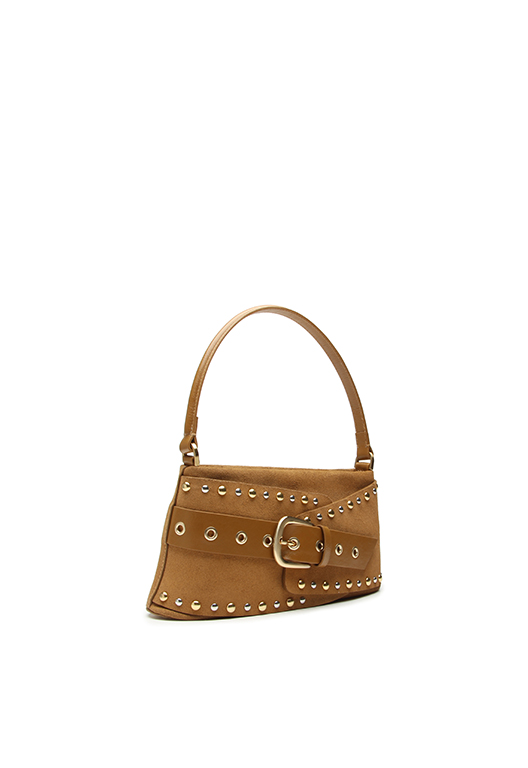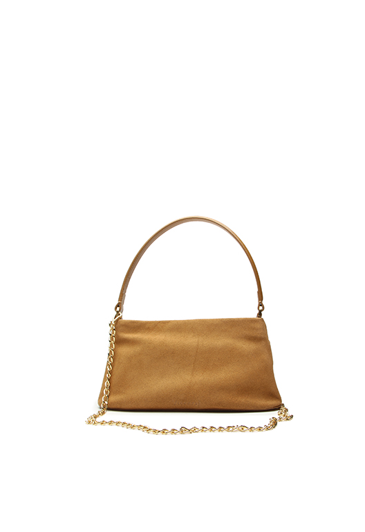 Medium caramel suede leather Thaila bag with a top handle. With a rustic boho look and a sophisticated western vibe, this piece is one of VCZ’s top bets for Summer ’26. The front buckle detail brings personality and authenticity to the design. The top handle and the longer chain strap offer versatile styling options and enhance the bag’s striking character. An ideal accessory for those who seek originality and attitude in their look.