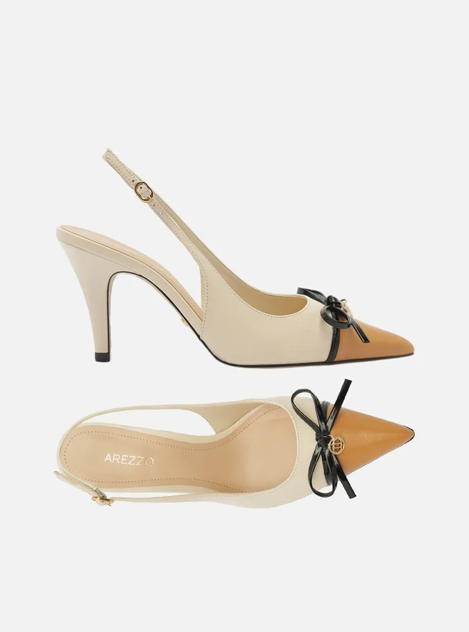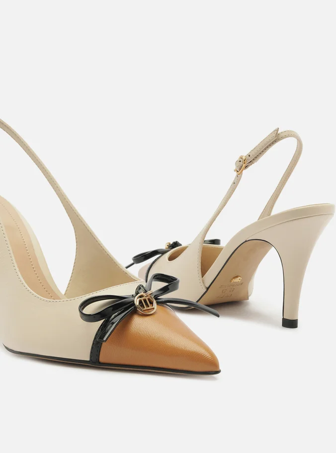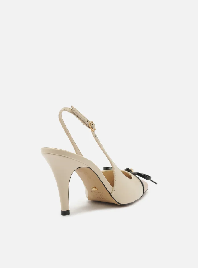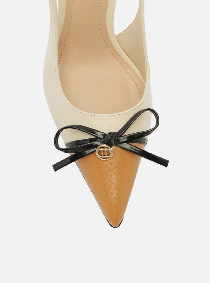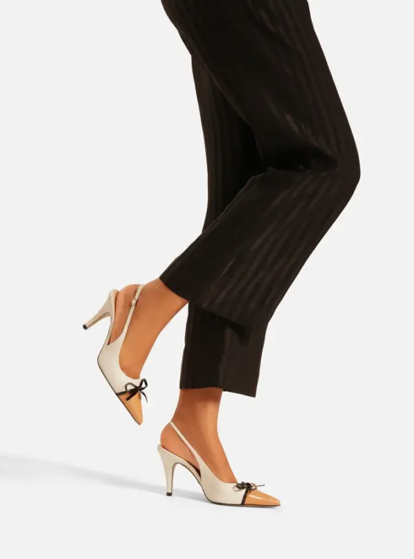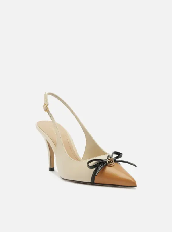 White leather pump. The shoe has a medium stiletto heel and a pointed toe. Closed design, featuring an upper with a rounded cut over the top of the foot, a brown toe cap, and a thin black strap with a bow and metallic detail. It has a thin strap connected to the upper that runs along the sides and around the heel, fastening with a metallic buckle. Comes with a beige insole and the brand name inscription.